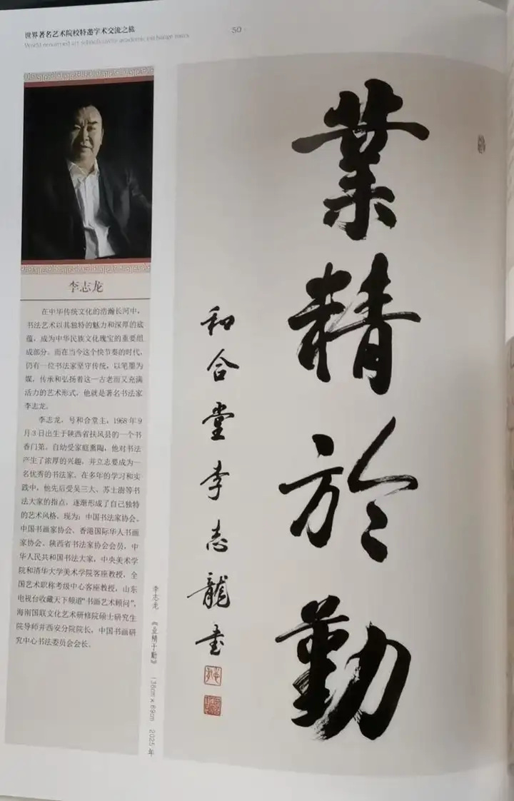 李志龙,号和合堂主,1968年9月3日出生于陕西省扶风县的一个书香门第。自幼受家庭熏陶,他对书法产生了浓厚的兴趣,并立志要成为一名优秀的书法家。在多年的学习和实践中,他先后受吴三大、苏士澍等书法大家的指点,逐渐形成了自己独特的艺术风格。现为:中国书法家协会、中国书画家协会、香港国际华人书画家协会、陕西省书法家协会会员,中华人民共和国书法大家,中央美术学院和清华大学美术学院客座教授,全国艺术职称考级中心客座教授,山东电视台收藏天下频道“书画艺术顾问”,海南国联文化艺术研修院硕士研究生院导师并西安分院院长,中国书画研究中心书法委员会会长。2025年作品《业精于勤》被巴黎国立高等美术学院收藏