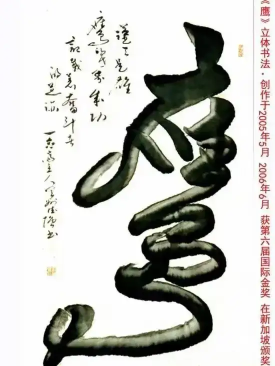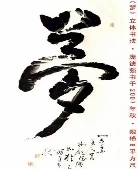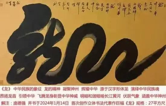 呈现出浓墨似远山如黛、凝峰如淡雾缭饶的奇绝景象···最终在二维平面上构建出具有视觉透视纵深感的明暗和谐视觉艺术的 "文字浮雕"。这种被他称为 "三维立体" 的创举,在八尺巨制立体书法《龙》