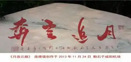 6.刻石。立体书法《龙》刻石于八达岭长城景区路西拔子段书画碑林。榜书《梦》《中国梦《月追云奔》刻石于西安咸阳机场海航航站楼。