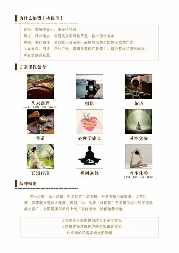 桃优里根据各民宿不同具体情况给出不同方案:以 “免费艺术课程+摄影+茶道+香道+心里学成长+灵性觉醒+冥想疗瑜+禅创密修+养生体验等+各种乐器(非洲鼓、古筝、吉它等)更多神级内容,跟据各店情况及地理位置,由店主选择所需内容及总都提供参考意见,共同打造具有竞争力差异化,打造优于同行业的卖点内容,多元经营模式提升溢价空间,让你的民宿更有故事更有内涵,让民宿创新赋能而不是单一的"住宿点",改革创新才是中国民宿未来的出路。