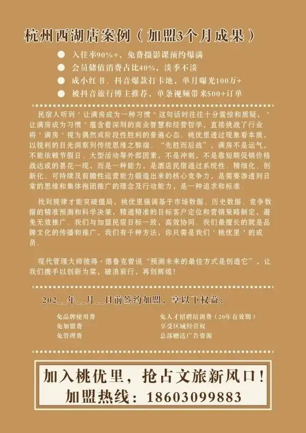 加盟热线见图片,欢迎咨询! 不做传统民宿,只做“桃优里”网红文化旅居品牌!