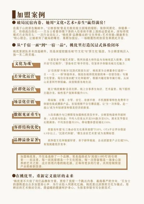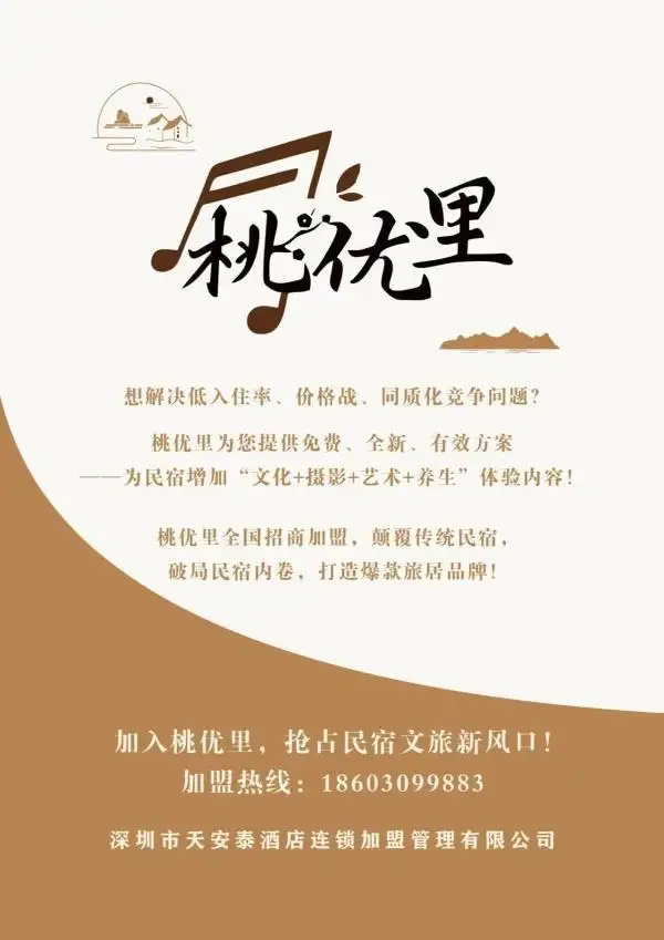 桃优里”——全国首家以 “文化+摄影+艺术+健康养生”为核心的特色民宿连锁品牌,为加盟商提供 差异化竞争方案,为住客打造 **独一无二的沉浸式旅游生活**